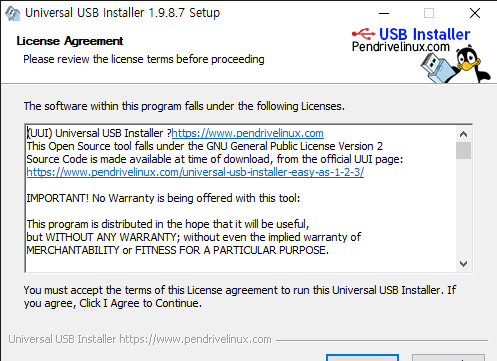 2번의 사이트에서 다운로드한 Universal USB installer를 실행시키면 다음과 같은 화면이 뜹니다.