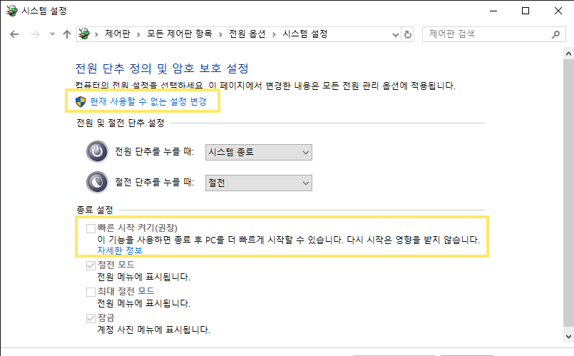 [현재 사용할 수 없는 설정 변경]을 눌러 활성화시킨 후 [빠른 시작 켜기]의 체크를 해제시킵니다.
