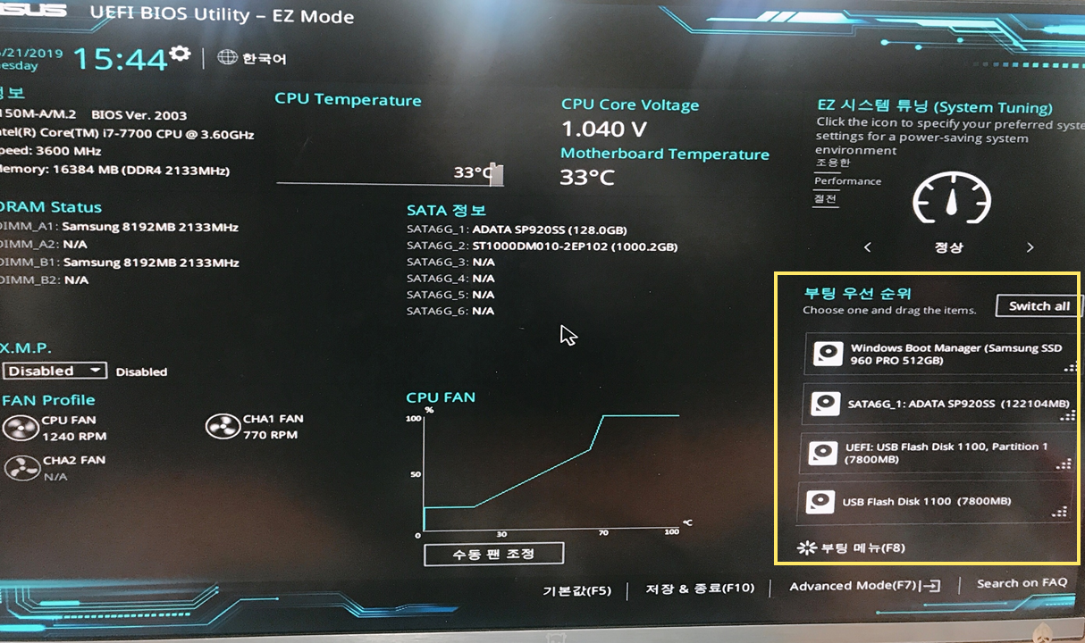 UEFI BIOS setting 화면입니다. 이 화면은 마더보드 제조사마다, 버전마다 조금씩 다르지만 해야 할 일은 동일합니다.