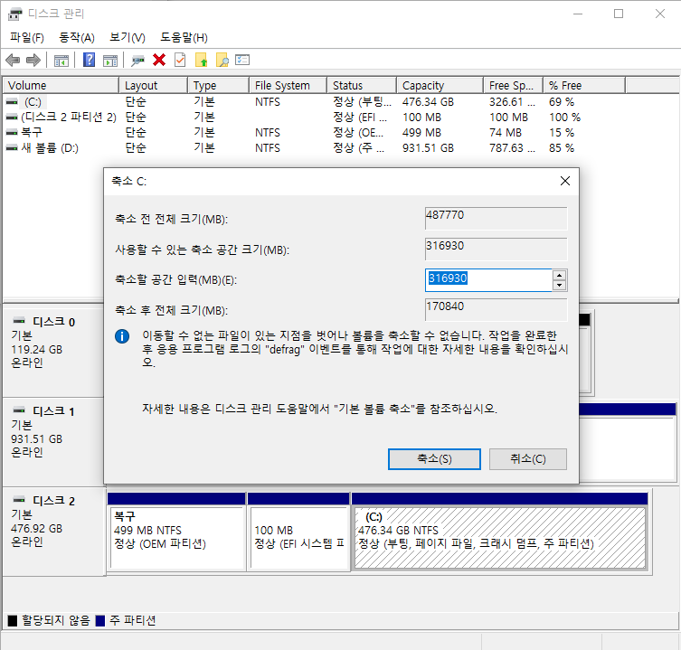 축소하려는 디스크의 마우스 우클릭을 하여 볼륨 축소를 누르면 "축소 공간 쿼리 중"이라는 메시지가 잠시 뜨면서 해당 디스크에서 사용 중인 용량을 제외하고 축소 가능한 용량을 계산해줍니다.
