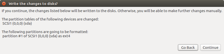 설치하려는 파티션이 포맷되고 바뀔 것이라는 메시지입니다. 뭔가 찝찝하다면 아까 파티션을 만들었던 공간의 이름과 비교하시면 됩니다. 아까 이름이 sda1이었으므로 동일하니 넘어갑니다.