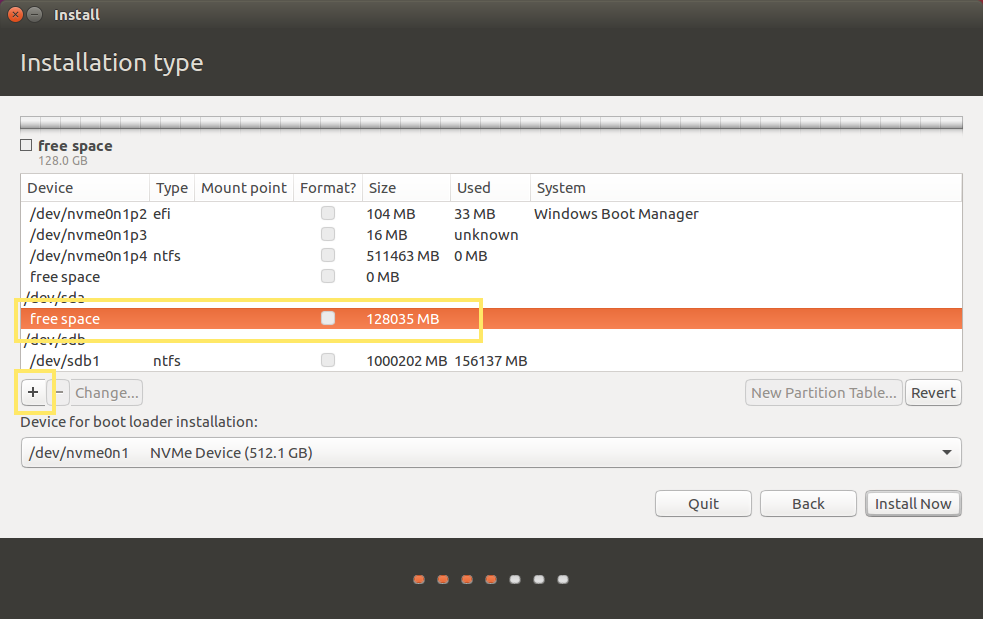파티션 선택 단계입니다. 미리 나눠뒀던 파티션을 찾아 선택합니다. 할당되어있지 않은 공간이므로 free space라는 이름으로 되어있습니다. + 를 눌러 해당 공간에 파티션을 할당해줍니다.