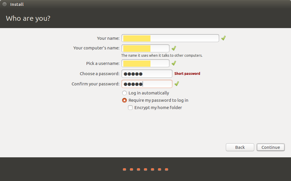 User name, Computer name, Password 등을 입력해줍니다. Continue를 누르면 설치를 위한 과정은 끝이 나고, 실제 설치가 진행됩니다.