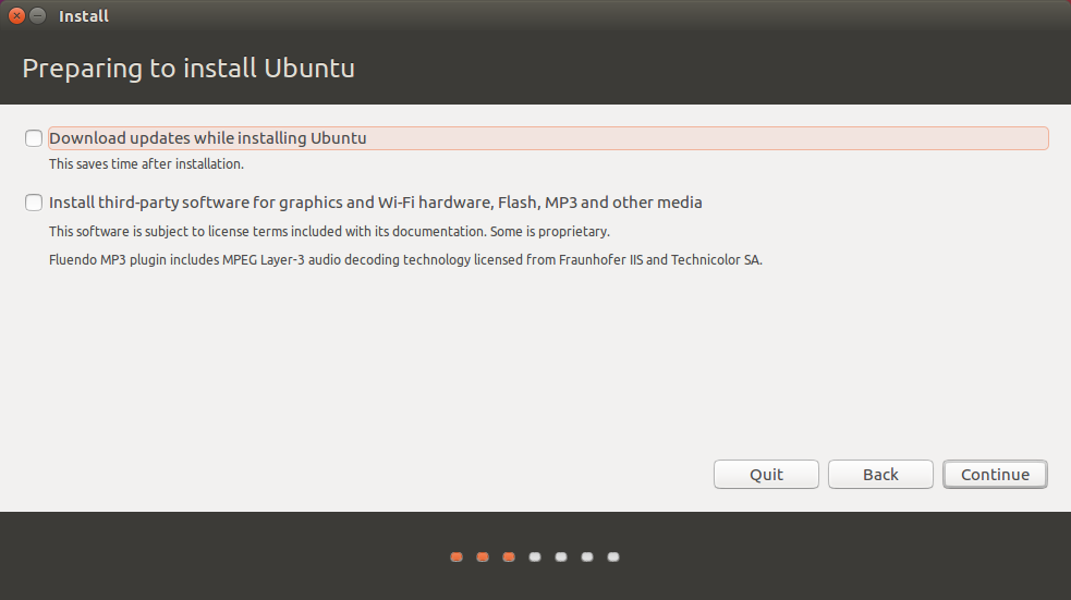 Updates나 third-party 등을 설치할 것이냐 묻는 단계입니다. 굳이 Ubuntu 설치 단계에서 할 필요는 없으므로 저는 체크하지 않고 넘어갔습니다.