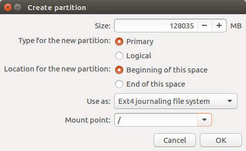 Primary, Beginning of this space, Ext4 journaling file system, / 로 세팅하고 OK를 눌러줍니다.