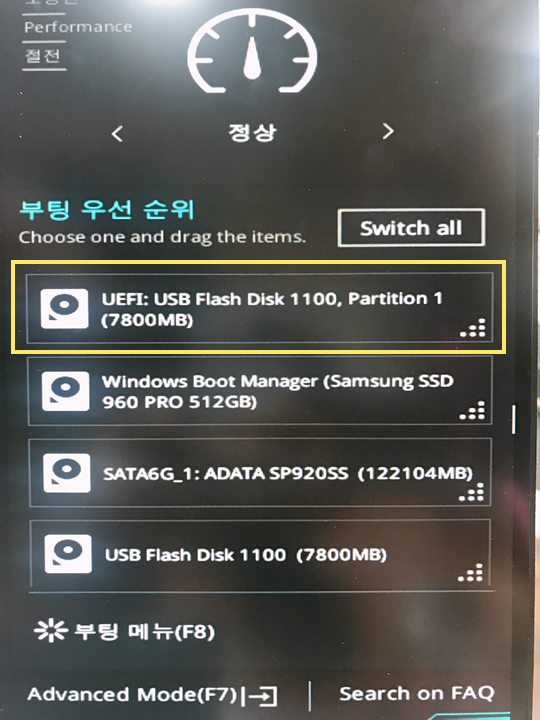 이 UEFI: USB Flash Disk를 가장 상위로 올려 첫 번째 순서로 만들어줘야 합니다.