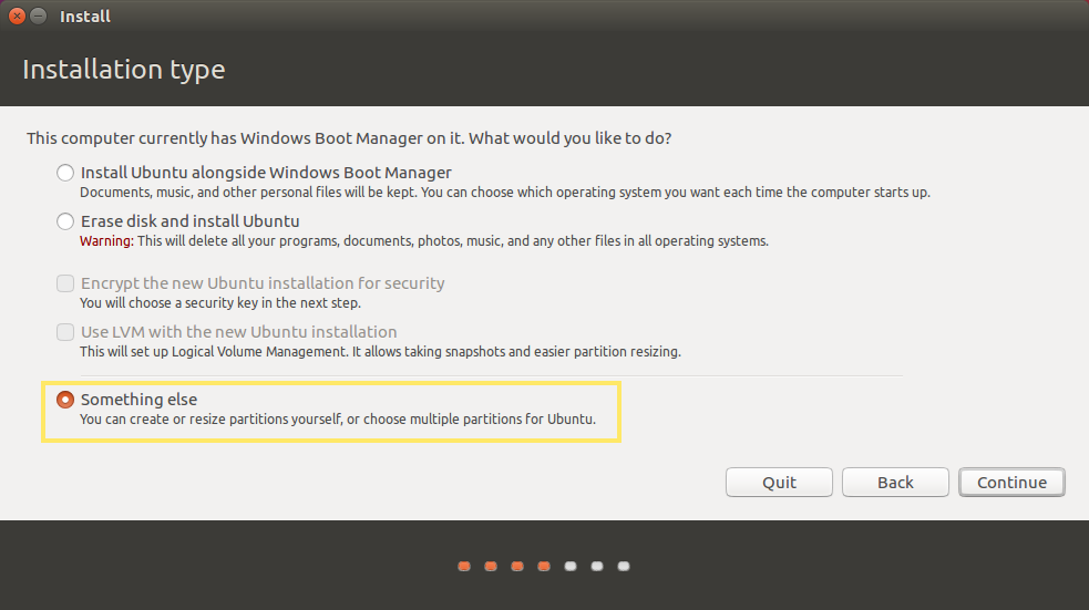이미 Window가 깔려있는데 어떻게 설치하고 싶냐 묻는 단계입니다. 원하는 파티션에 Ubuntu를 설치하고 싶으므로 Something else를 선택합니다.