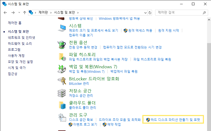 [제어판] - [시스템 및 보안] - [관리 도구] - [하드 디스크 파티션 만들기 및 포맷]으로 들어가면 디스크 관리 창이 뜹니다.