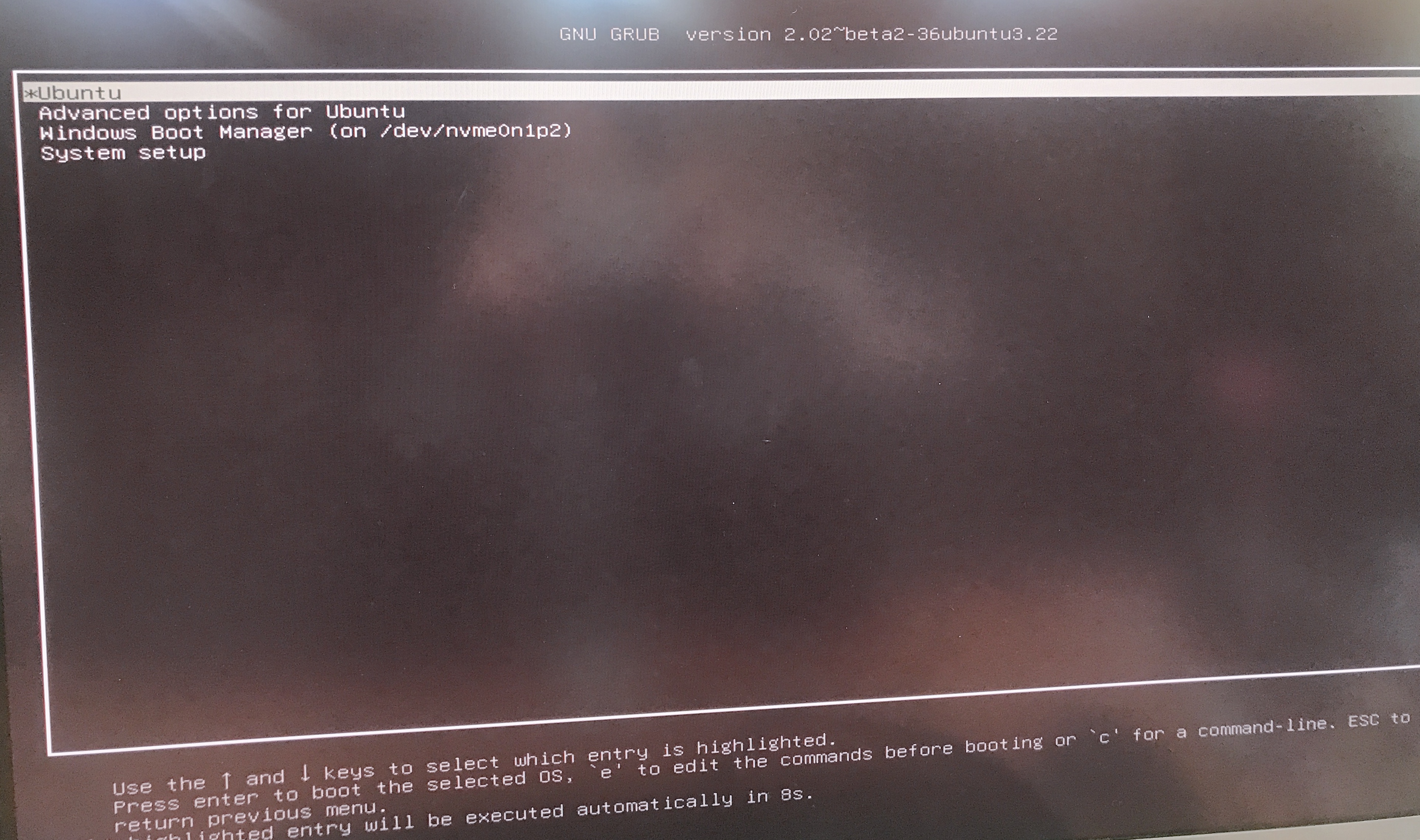 Ubuntu가 성공적으로 설치된 후엔 다음과 같은 화면이 뜹니다. Ubuntu를 선택하면 방금 설치한 Ubuntu를, 세 번째의 Windows Boot Manager를 선택하면 기존에 사용하던 Windows를 사용할 수 있습니다.