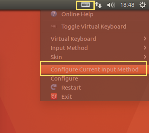 상단바의 아이콘이 키보드 모양이 fcitx 입력기를 사용한다는 의미입니다. [Configure Current Input Method]로 들어가 줍니다.