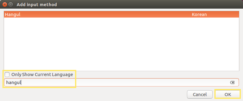 [Input Method] 탭에서 좌측 하단의 [+]를 눌러 Hangul을 찾아 추가해줍니다. 검색할 땐 Only show Current Language의 체크를 해제해야 합니다.