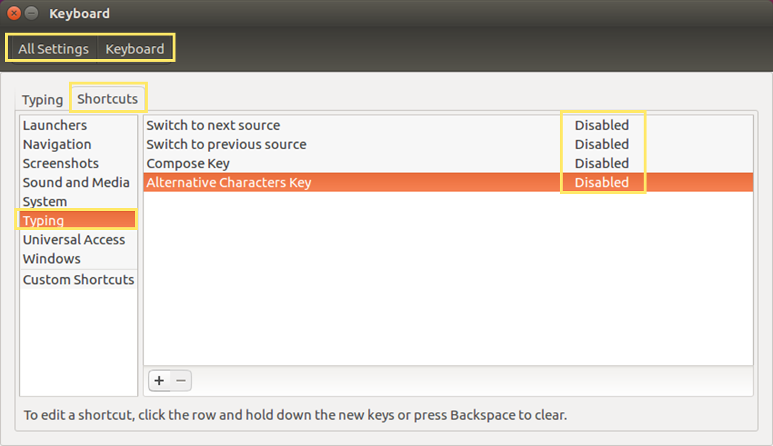 [System Settings] - [Keyboard]로 들어가서, [Shortcuts] - [Typing]의 Switch to next source, Switch to previous source, Compose Key, Alternative Charaters Key를 전부 Disabled 상태로 만들어 줍니다. 각각을 선택 후 backspace key를 누르면 Disabled 상태로 만들 수 있습니다.