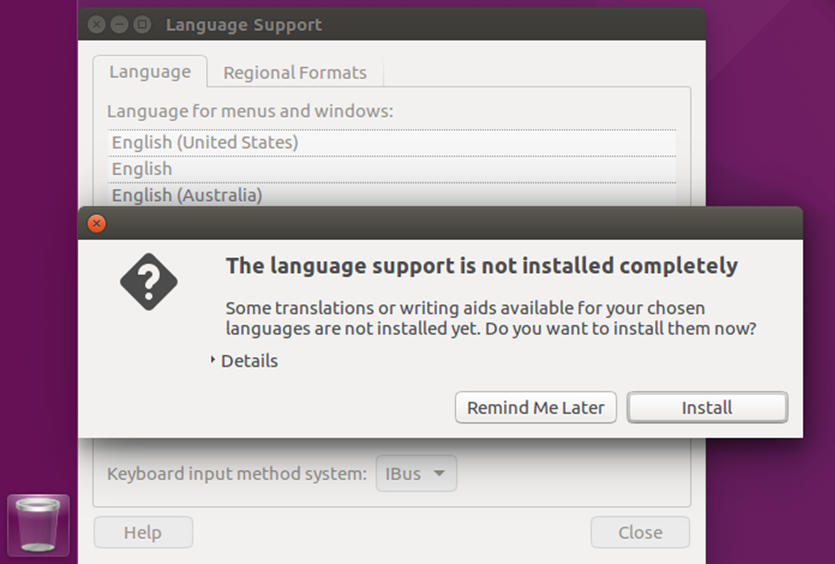 [System Settings] - [Language Support]로 들어가면 메시지가 하나 뜹니다. install을 누르고 설치될 때까지 잠시 기다려줍니다.