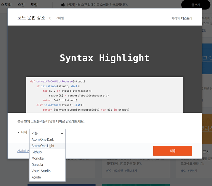 Syntax Highlight 의 원하는 테마를 선택하고 적용해줍니다.