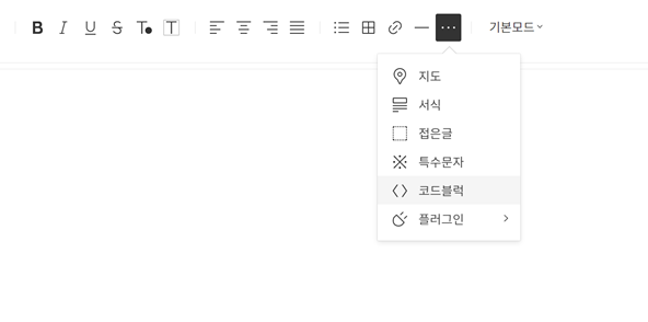 티스토리의 새로운 에디터 입력 페이지에서 더보기를 클릭하여 코드 블록을 선택해줍니다.
