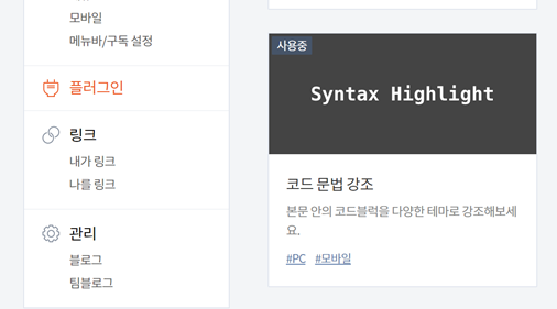 티스토리 관리 페이지의 플러그인 메뉴에서 Syntax Highlight 플러그인을 찾습니다.